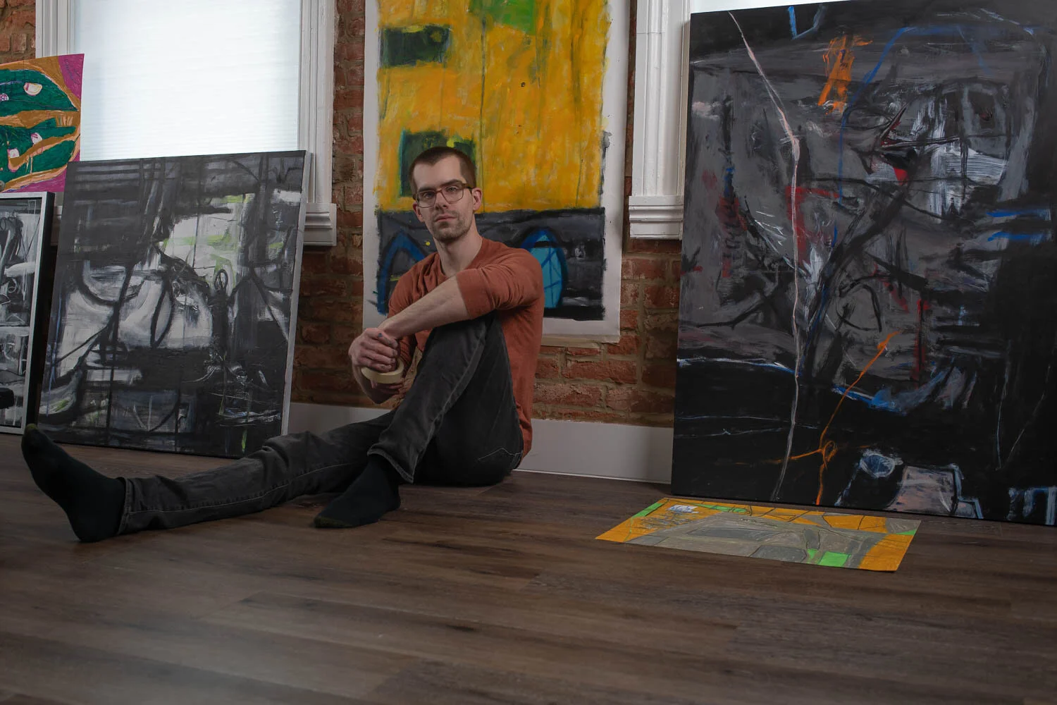 I search for the key to the mysterious layers of lines, color, and texture. I seek to find and develop the focal point, like a beacon in the chaotic noise of life. I believe in balancing outbursts of spontaneity, which bring a piece alive, with deliberate and deeply considered refinements that bring focus and clarity. To achieve the adoration of specific areas of the work, other aspects must be neglected, obscured, or destroyed to achieve a new harmony. I may paint or draw a single line or shape repeatedly, scraping away the edges with my finger, erasing with one color only to re-apply the shades from the previous layer, repeating the obliteration and restoration until what I see has the right intensity and rhythm.